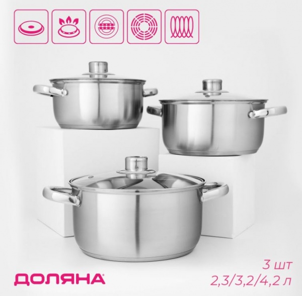 Набор кастрюль из нержавеющей стали, 3 предмета: 2.3 л, 3.2 л, 4.2 л, крышки (50675)